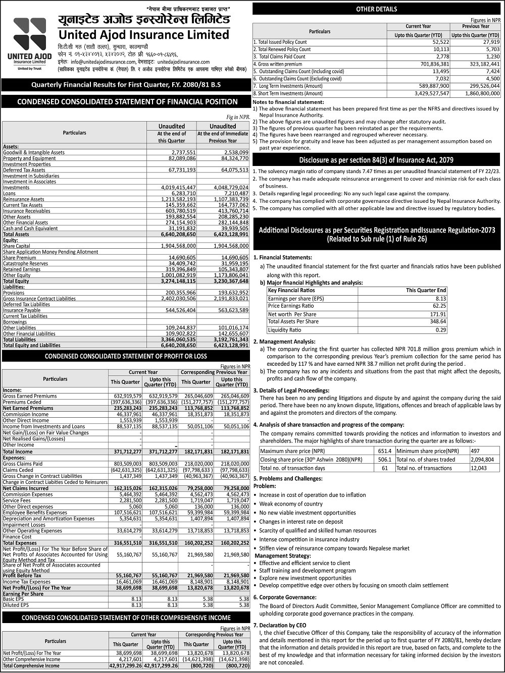 Quarterly Financial Results For First Quarter, F.Y. 2080/81 B.S