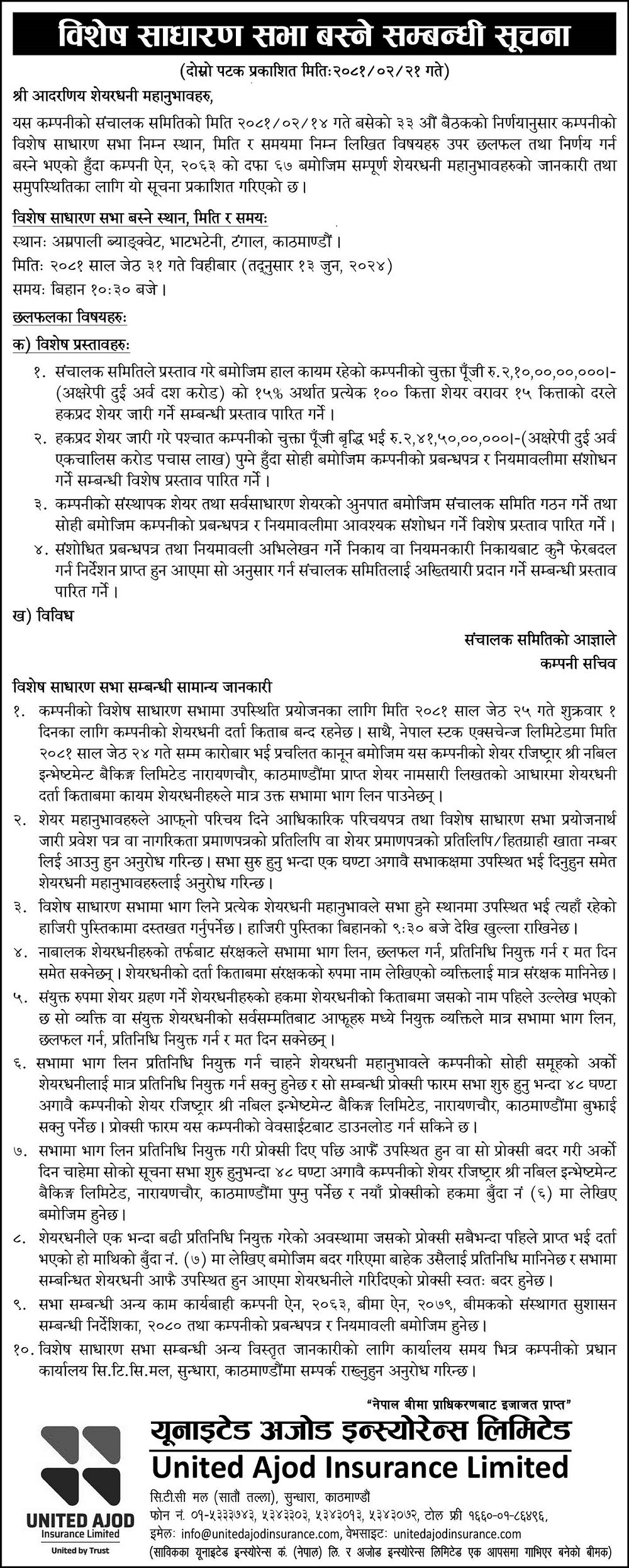 United Ajod Insurance SGM 2nd Notice 2081